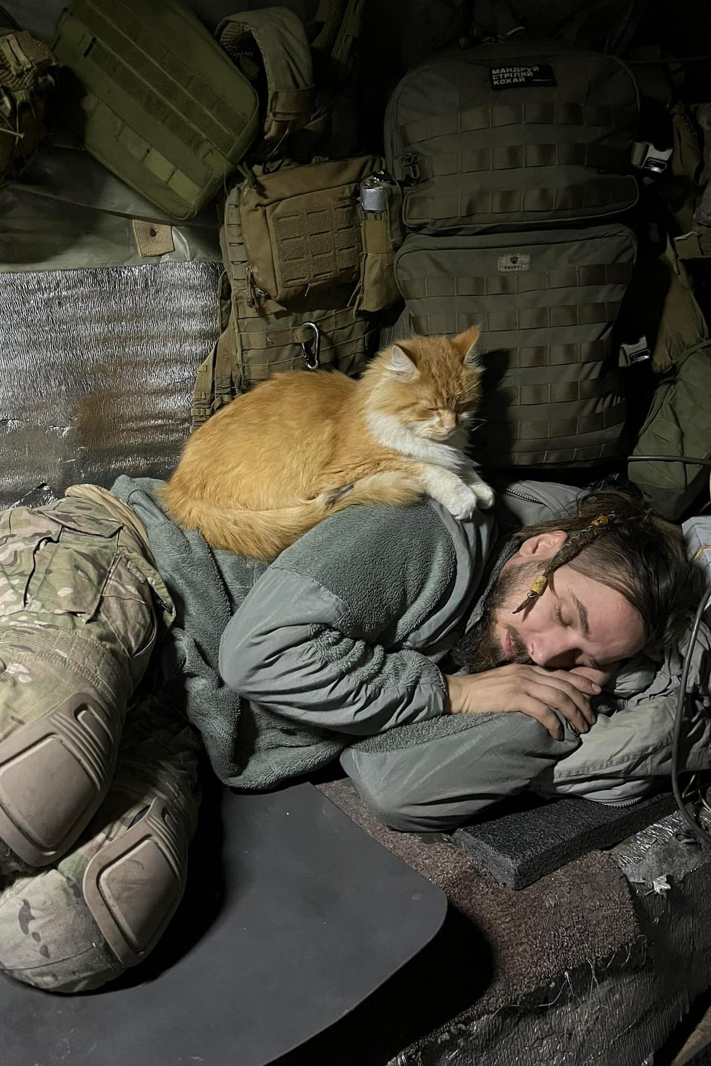 In Ukrainian (The first two poems is taken from here and here, the rest is from my copy of Maksym’s book ″Вірші з бійниці″) *** Хочу розповісти вам історію про велетенського кота рудого як висохлі серпневі покоси він має лиш білий нагрудник сумні зелені наче зелене масло очі часто прижмурює брови наче вивчає наукову працю бо сонця тут не трапляється коли ви востаннє бачили сонце свого часу на початку осені він був загрозою усіх тутешніх мишей ей це бліндаж великого рудого кота пробігай повз нього як найшвидше шепотіли вони між собою. Одного разу він намагався спіймати мишку у лінивому але феноменальному стрибку пролітаючи над пальником з відкритим блакитним полумʼям тепер обпалені неохайні смішно закручені як у відомого художника уже не такі довгі вусики нагадують про той легендарний стрибок. Він вмощується на краєчку полиці для сну поруч з входом в бліндаж завішеним двома шарами ковдри і розглядає щось крізь маленькі щілинки можливо когось ворога або друга лисицю або людину вичікує. Кіт знає кожну стежку кожен окоп нірку бліндаж він має одну таємницю коли на вулиці роздається страшенно гучний і грізний безладний галас і здригається земля це прокидаються давні велетні йдуть у своїх справах він митттєво застрибує в діру в обшивці та й ховається десь в глибинах та катакомбах невеличкого бліндажа і не висунеться ще чого допоки велетні не находяться. Коли він засинає повільно витягує передні лапки йому сниться літо сниться цілий цегляний будинок сняться кури які бігають по подвірʼю сняться діти які частують пиріжками з мʼясом в мене з рук випадково скочується шолом падає на багнюку кіт прокидається прижмурює очі уважно роздивляється навколо свої: засинає. *** шість років війни хіба я міг знати коли в дитинстві збирав стиглі яблука на кінці серпня. Хто б міг подумати я блукав разом з другом по промзоні міста збираючи метал залишки запчастин на дорозі 30 копійок за кілограм та ще й обважують щоб купити трохи Південної ночі та пограти в Халф-Лайф а тепер я збираю в посадці залишки хлопців людей наче і виглядає як людина чи частина людини немає на світі нічого настільки холодного. Потрібно створити додаток карту Лісового кладовища стовпчик номер 58 від нього 4 кроки вперед і третя могила праворуч - його путівник кладовищем всі лиш про це і говоритимуть. Довгий жовтий автобус-гармошка під номер 10 всього декілька на маршруті 25 копійок проїзд завжди наповнений людьми як ринок напередодні «першого вересня» потрібно міцно притискувати сумки чи наплічник бо ходять крадії непомітно розрізають шкірзам забирають останні гроші але сьогодні в мене викрали дещо більше: море. Мене ковтає кит суму я тут наче Йона та не можу вибратися вже шість років хоча це триває завжди війни не закінчуються закінчуються люди хто б міг подумати. *** Господь лісу огортає м’якою як замша вогкістю Його сльози спадають з листочків щойно поди́хає дихання Його важке як у курця. Господь автоматичного гранатомета зайвого не говорить зайвого не подумає Його слово тверде як обсохла земля його обійми гарячі як доменна піч Його молитва триває рівно 32 слова короткими чи довгими чергами Його волосся опадає тонким гіллям ягодами терну. Господь сну раптовий як літній дощ він лишає наодинці він стирає слова наче коректором і пише нові нерозбірливим лікарським почерком. Я заходжу в келію бліндажа ставлю окопну св